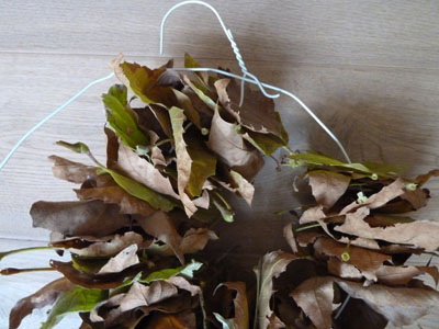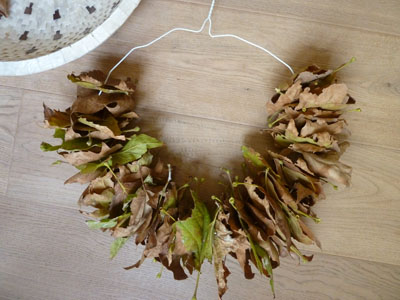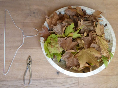 Die Kinder fädeln die Blätter jeweils in der Blattmitte auf und machen solange weiter, bis der Draht voll ist. Man braucht dafür mehr Blätter, als man denkt, und es kann gut sein, dass Sie am nächsten Tag noch einmal Blätter suchen müssen, um den Kranz fertigzustellen. Wir fanden eine Kombination aus frischen und getrockneten Blättern besonders schön. Achten Sie aber darauf, dass die Blätter nicht zu trocken sind, da sie sonst sehr empfindlich sind und zerbrechen. Die frischen Blätter machen sich sehr schön im Kranz, während sie langsam trocknen. Wenn Sie einen kleineren Kranz haben wollen, schneiden Sie einfach ein Stück vom Draht ab.