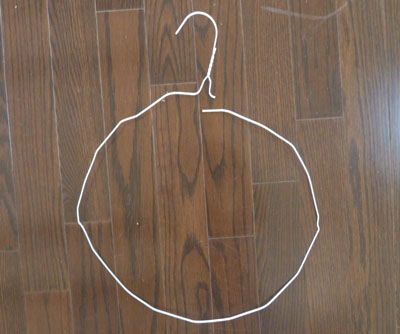 Geben Sie die Blätter in einen Korb. Bereiten Sie den Kleiderbügel vor, indem Sie ihn zu einem Kreis zurechtbiegen. Benutzen Sie die flache Seite des Seitenschneiders, um die unebenen Stellen des Drahts etwas zu glätten und eine schöne Kreisform herzustellen. Lassen Sie den Haken dran, damit Sie den Kranz daran aufhängen können. Schneiden Sie den Draht wie hier abgebildet nahe des Hakens durch:
