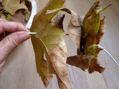 Nun können die Kinder beginnen, die Blätter auf den Draht aufzufädeln. Das ist eine tolle feinmotorische Übung für kleinere Kinder.