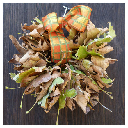 Befestigen Sie am oberen Ende eine herbstliche Schleife und/oder bringen Sie noch eine entsprechende Aufschrift auf dem Kranz an.