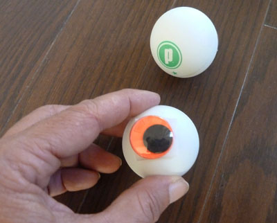 Erzeugen Sie Halloween-Atmosphäre, indem Sie zwei Augäpfel auf Ihrem Blätterkranz befestigen. Kleben Sie dazu einfach große Wackelaugen (am besten in Orange) auf Tischtennisbälle.