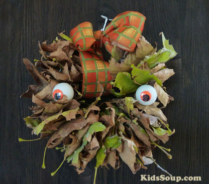 Gehen Sie im Herbst, wenn sich die Blätter verfärben, nach draußen und sammeln Sie Blätter und lassen Sie die Kinder die Blätter zu einem schönen Kranz auffädeln, der wunderschön an der Haustür aussieht. Um ein wenig Halloween-Atmosphäre zu erzeugen, können Sie als gespenstischen Willkommensgruß auch noch zwei Augäpfel auf dem Kranz anbringen.