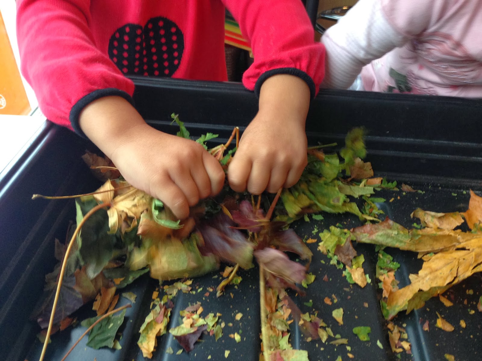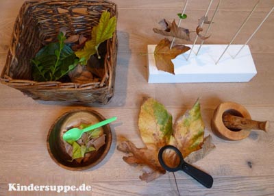 Geben Sie Blätter (getrocknete und frische Blätter) in einen kleinen Korb. Stellen Sie Scheren, Reibschalen und Stößel, kleine Behälter, Styroporblöcke mit Holzspießen und optional auch einen kleinen Plastikhammer auf dem Tisch bereit. Lassen Sie die Kinder mit den Blättern arbeiten, indem sie sie zermahlen, zerschneiden, zerbröseln, übereinander stapeln oder zerreiben.