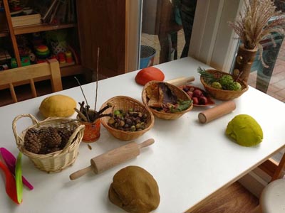 Sammeln Sie Herbstblätter, Eicheln, Tannenzapfen, Tannennadeln, Zweige usw. und stellen Sie sie in kleinen Körben auf einen Tisch. Stellen Sie zudem noch herbstlich duftende Knete und Nudelhölzer bereit. Lassen Sie die Kinder mit den verschiedenen Materialien spielen und Fantasielandschaften erschaffen.
