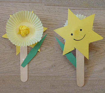 Drucken Sie die Sonnenblüte-Druckvorlage aus und zeichnen Sie den Umriss auf das gelbe Bastelpapier und schneiden Sie die Form aus. Zeichnen Sie ein Gesicht auf die Sonnenblüte. Danach kleben Sie das Sonnengesicht auf das Holzstäbchen. Auf die Rückseite des Holzstäbchen kleben Sie die Muffin-Form mit einem Seidenpapier-bällchen. Zum Schluss befestigen Sie noch ein grünes Bastelpapierblatt.