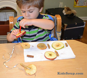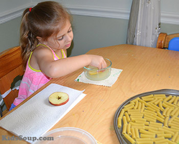Formen Sie aus einem Stück Pfeifenputzer eine Nadel, ziehen Sie die Schnur auf die Pfeifenputzer-Nadel und fädeln Sie abwechselnd Äpfel und Nudeln auf die Schnur.