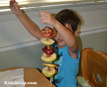 Schneiden Sie die Äpfel in Scheiben. Lassen Sie die Kinder die Apfelscheiben anschließend für ein paar Minuten in die Zitronen-Wasser-Mischung legen.