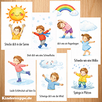 Spielen Sie die Musik und lassen Sie die Kinder wie Regentropfen um einen offenen, mit der Oberseite nach unten aufgestellten Regenschirm tanzen. Wenn die Musik anhält, stehen die Kinders still und strecken die Armen zur Seite um die strahlende Sonne darzustellen.